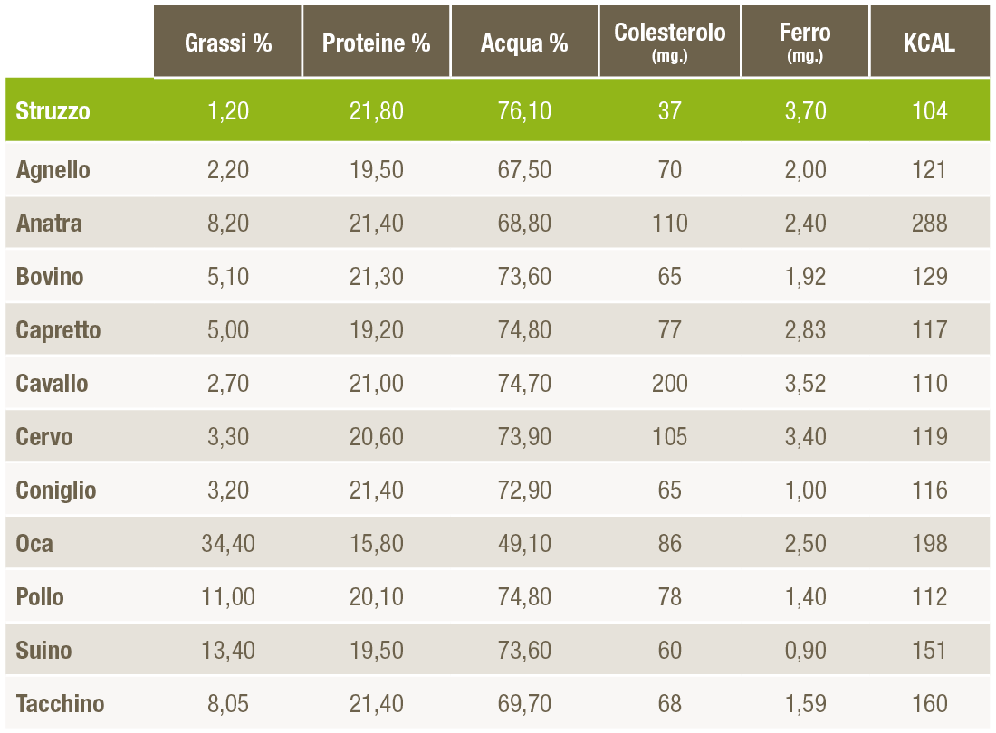 Facciamo un po’ di pubblicità comparativa: la carne di struzzo è una carne rossa, ma con contenuto di grassi e di colesterolo inferiore persino alle carni bianche, è ricca di ferro e proteine. I suoi grassi sono quelli buoni, i grassi polinsaturi (Omega3). Questa carne viene pertanto indicata per una dieta sana ed equilibrata, è tenerissima e si presta ad ogni ricetta, dal filetto allo spezzatino. Dai un occhio alla tabella nutrizionale, vedrai che la carne di struzzo è il campione del benessere: pochi grassi, tante proteine, pochissimo colesterolo, tanto ferro e poche calorie.